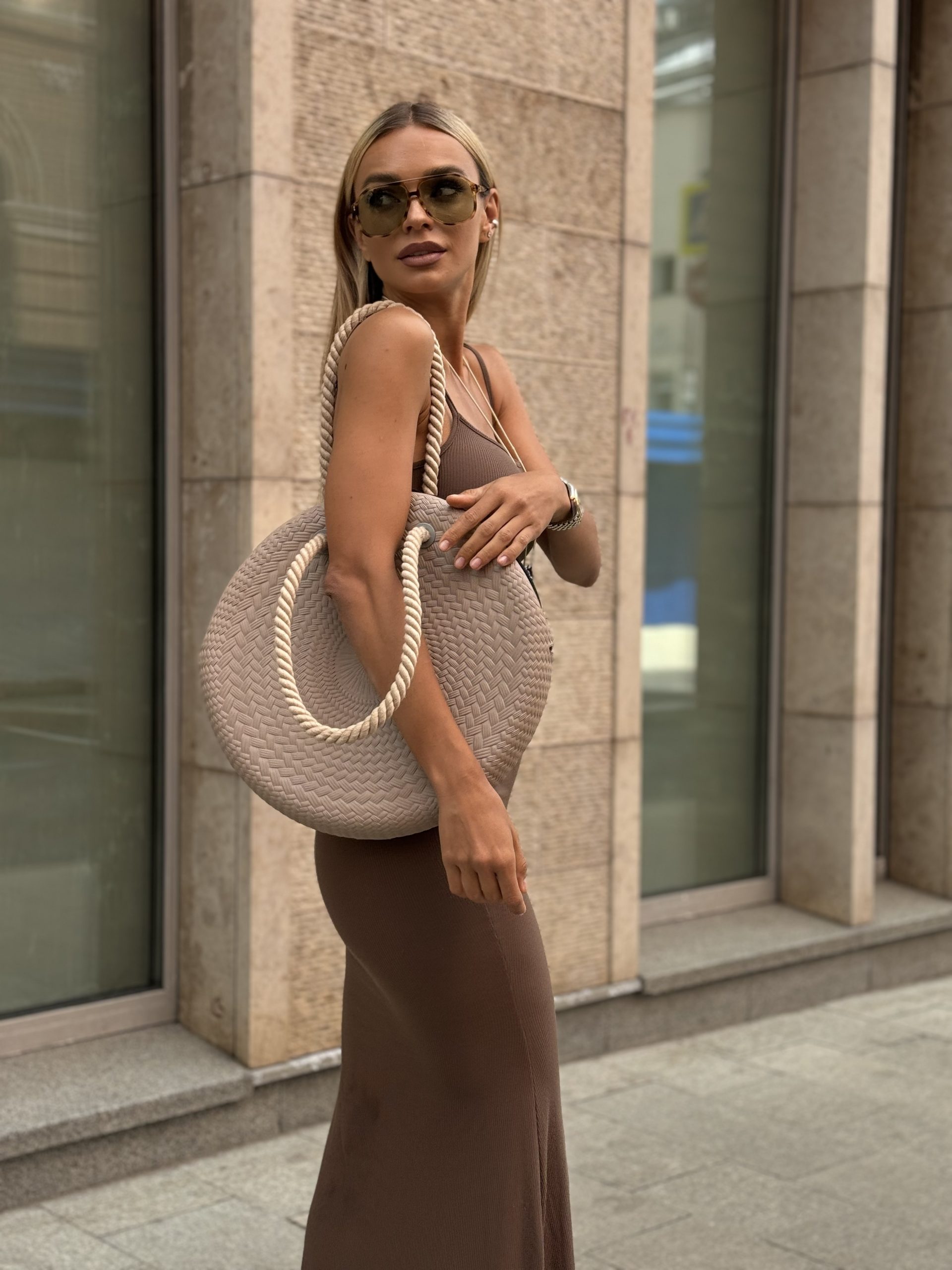 С чем сочетать: Крупные сумки лучше всего смотрятся с облегающими силуэтами – узкими джинсами, приталенными жакетами или платьями-футлярами. Это создает гармоничный баланс пропорций в образе.